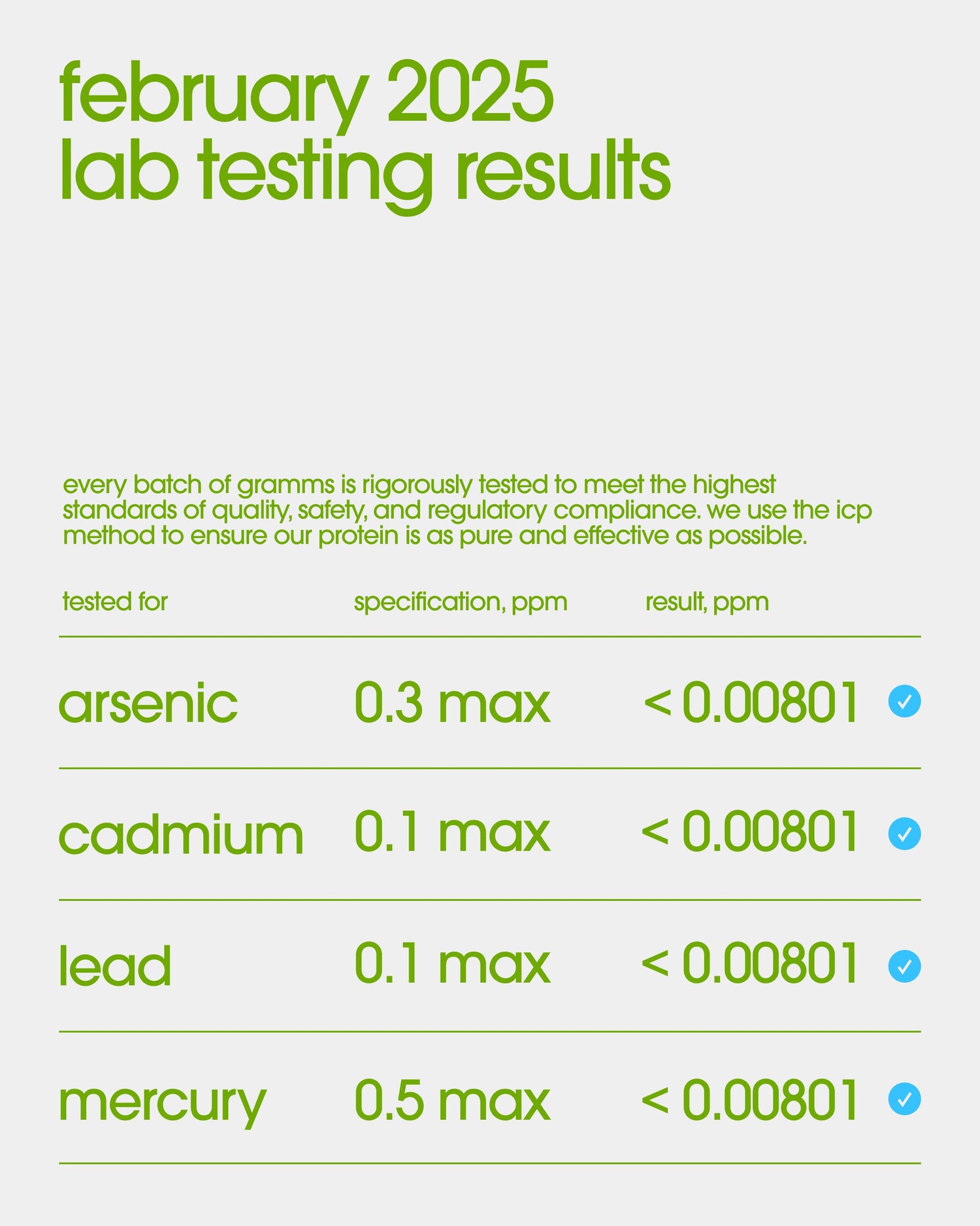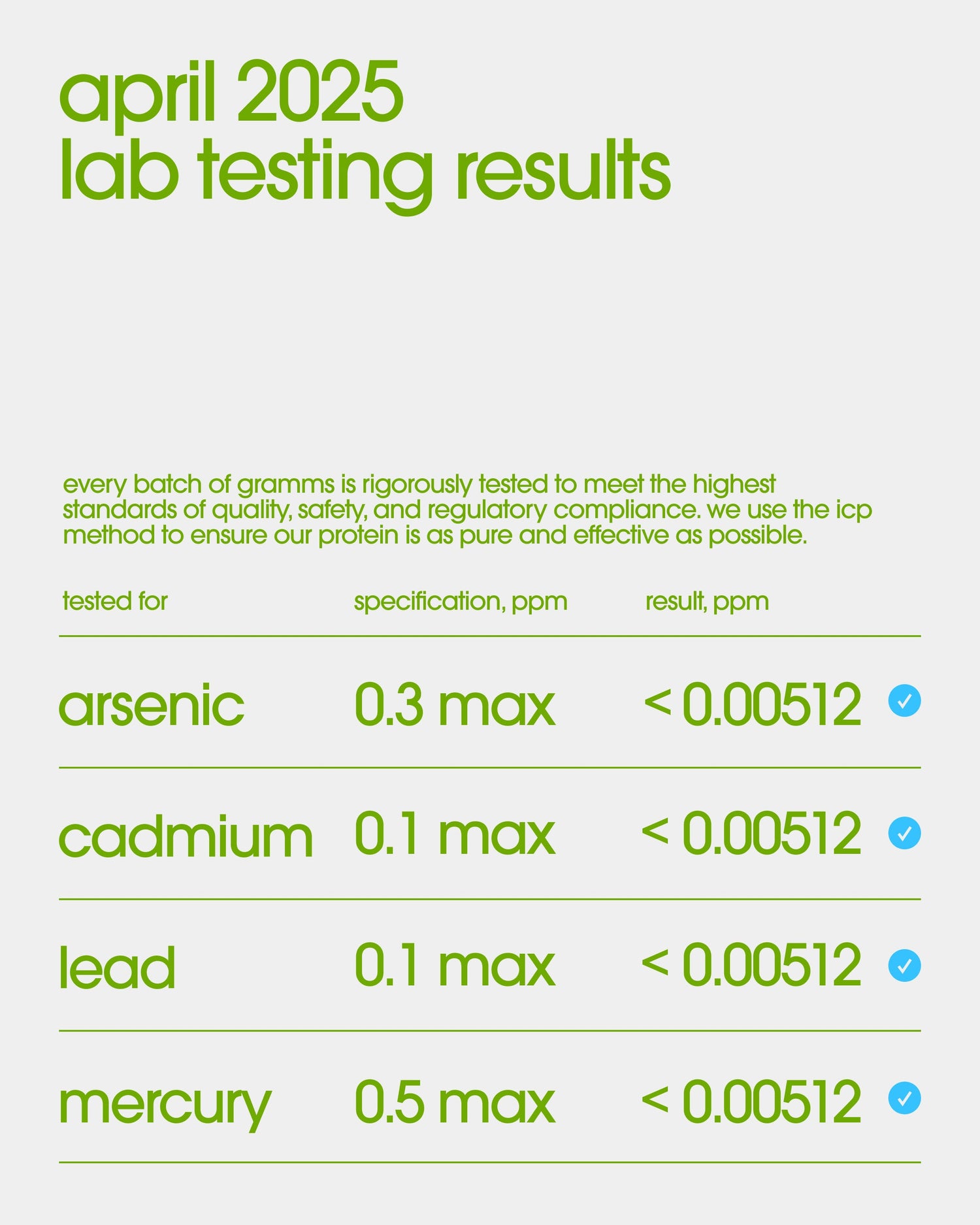 yes. we prioritize product quality and transparency, which is why we conduct rigorous testing at various stages of production to ensure our products meet the highest standards for purity, potency, and safety.  our whey protein isolate undergoes third-party testing by independent laboratories to verify its quality and authenticity, and each batch of gramms undergoes another round of lab testing to check heavy metal content, active ingredient content and monitor for microbiological contaminants.
